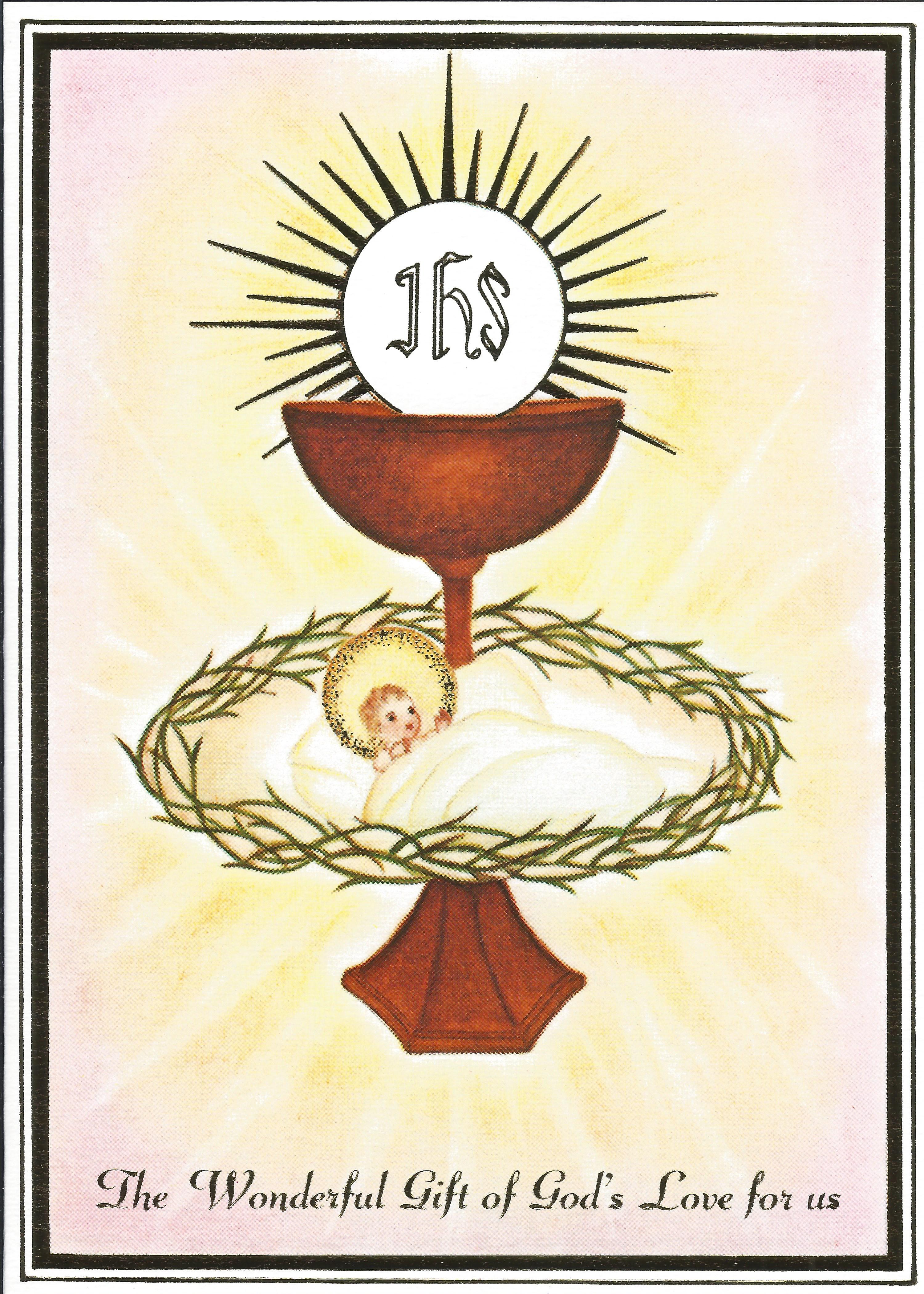 Artwork by the Nuns with gold embossed foiling. 5 x 7 card with card stock insert. Your personal message (optional) will be printed on vellum paper and enclosed in the card. Shipped in double envelope.
