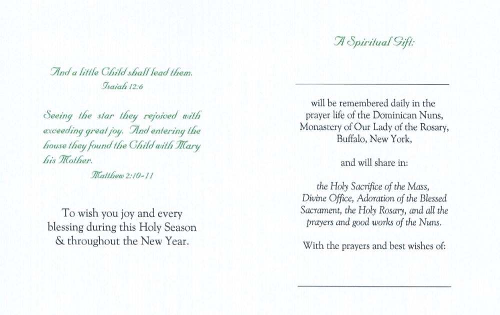 Spiritual Bouquet Cards: Enroll your loved one in the prayer life of the nuns. Spiritual Bouquet Cards are 4.5 x 6" on matte card stock, with paper insert. Artwork by the nuns. Shipped in double-envelope.