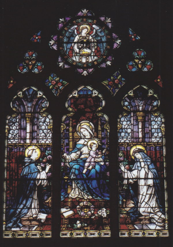 Stained glass window in the Monastery Chapel. Features Mary and Jesus with Saint Dominic and Saint Catherine of Siena. Holy Cards are 4.75″ W x 6.75″ H on matte card stock.